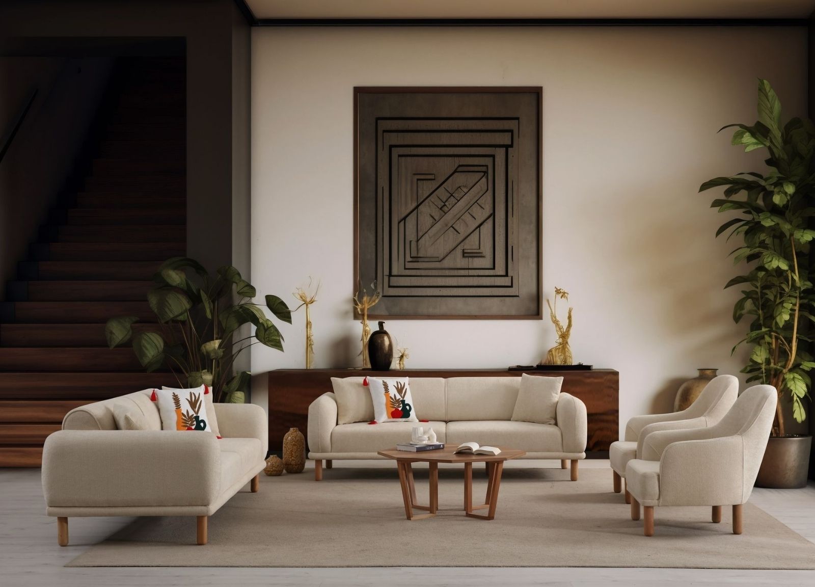 - Desenli halılar: İçerisinde bej tonları bulunan desenli halılar, hem uyum sağlar hem de dekorasyona hareket katar. Geometrik desenler modern, klasik desenler ise daha geleneksel bir hava verir.